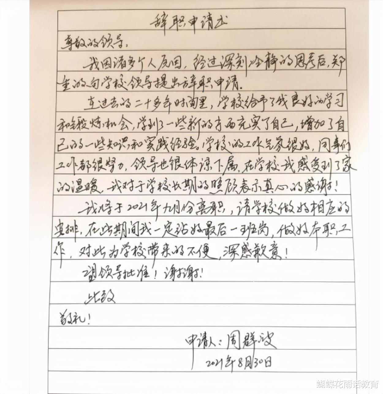 从字里行间里,我们应该能够读出,他对教育还是眷恋和不舍的。他表达了对学校的感谢,对学校领导和同事的认可。同时,也对学校对自己的照顾表示了感谢。按照正常的思考,这些难道不足以让他停下离开的脚步吗?而最让人不解的是,他为什么要选择在即将开学的这个当口呢?是不是有着什么言外之意呢?