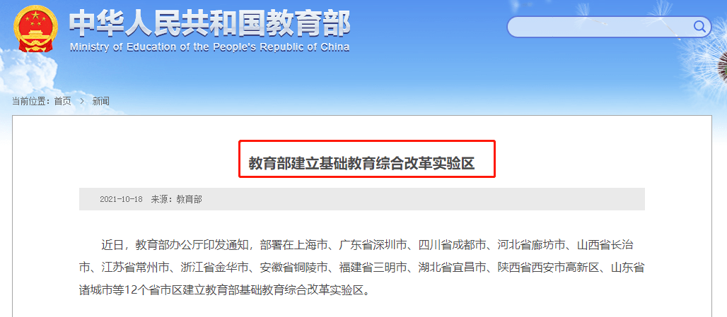 四个月前,教育部办公厅印发通知,部署在上海市、广东省深圳市、 四川省成都市、河北省廊坊市、山西省长治市、江苏省常州市、浙江省金华市、安徽省铜陵市、福建省三明市、湖北省宜昌市、陕西省西安市高新区、山东省诸城市等12个省市区建立教育部基础教育综合改革实验区,也是第一批试验区,旨在全面提高基础教育质量。